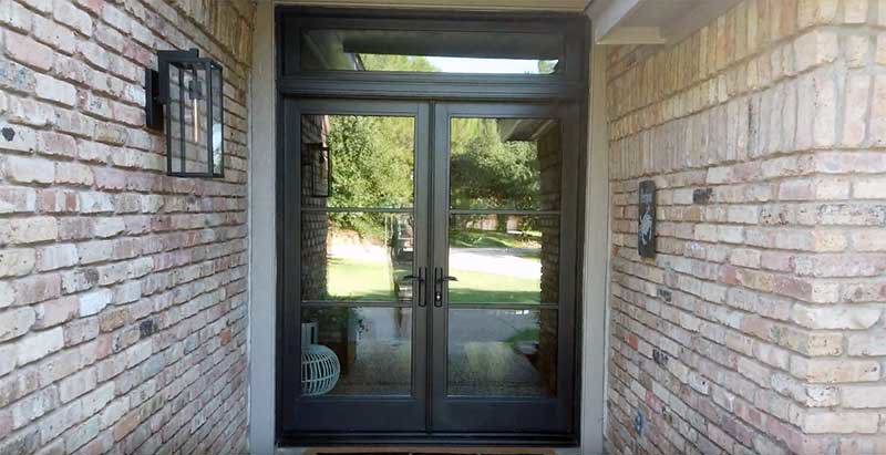 Prior to the remodel, the house had cream-color double doors with half glass panels. The glass in the doors had diamond-pattern grids and decorative glass in the transom as well.