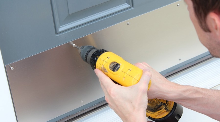 Installing a kick plate is fairly easy. Start by getting the proper measurements. You’ll need measure the width of the door↗ while keeping it open. Remember to leave around an inch of space on either side, and place the kick plate a little over a half inch above the bottom of the door. Use some tape or adhesive for temporary placement while you fix the screws making sure the plate is perfectly leveled.