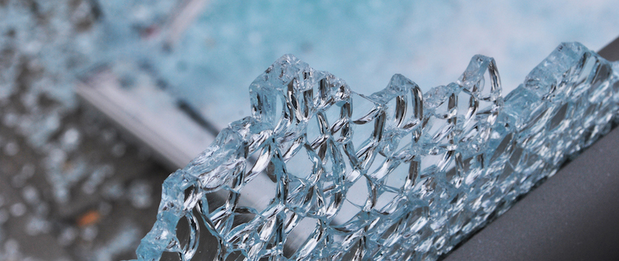 Nicknamed "toughened glass," tempered glass is a safety glass. Unlike laminated glass, which is stuck together by a vinyl interlayer, tempered glass can still shatter. While it can hold its shape within a frame if cracked and broken, if the glass breaks loose, then you will find pebble-like bits, rather than shards and splinters like ordinary annealed glass. The pieces are mostly harmless.