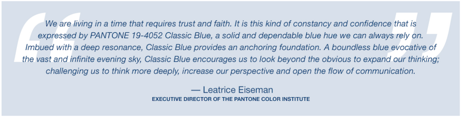 According to The Pantone Color Institute, PANTONE 19-4052 Classic Blue is “A timeless and enduring blue hue, PANTONE 19-4052 Classic Blue is elegant in its simplicity. Suggestive of the sky at dusk, the reassuring qualities of the though-provoking PANTONE 19-4052 Classic Blue highlight our desire for a dependable and stable foundation on which to build as we cross the threshold into a new era.”
