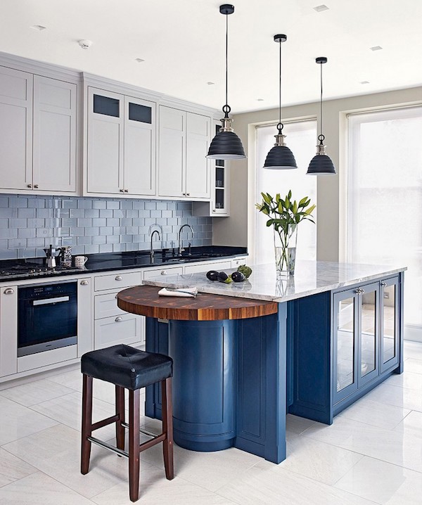 Every cabinet doesn’t have to be blue. The kitchen above features a blue island with a small wood top peninsula and another shade of blue is used on the horizontal tile backsplash.
