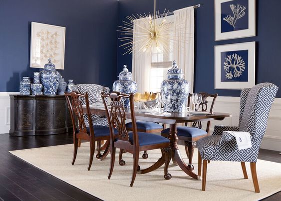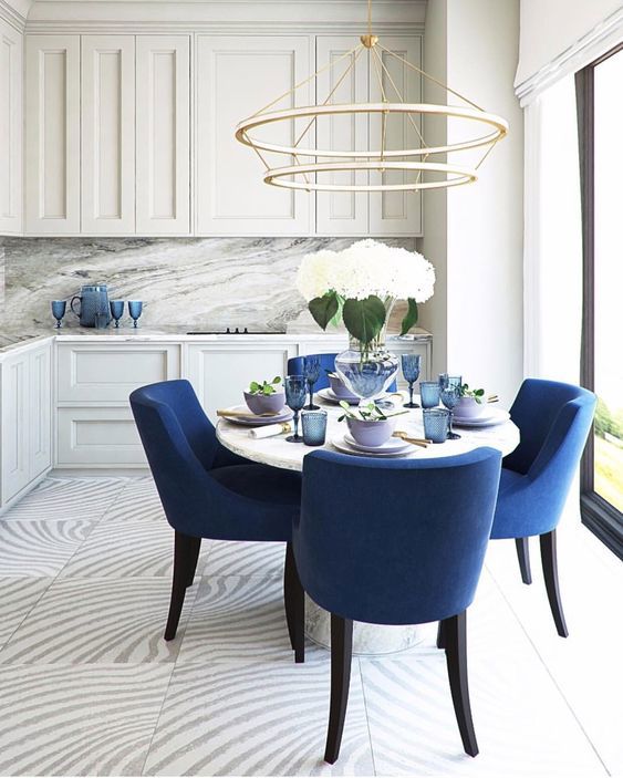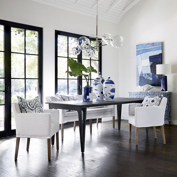 Create the kind of dining space that will make you want to host dinner parties every weekend. Guests appreciate beautiful and comfortable spaces. Blue is a beautiful color that pops in contemporary white rooms and can also be paired with wood tones.