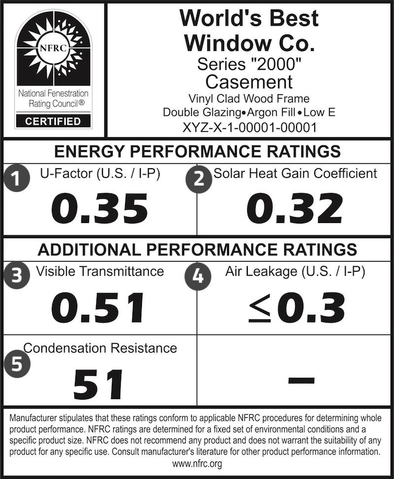 The NFRC provides three to five individual ratings on its labels. These ratings let you know how the window performs in each of the categories. Much like mileage stickers on cars, NFRC labels help you compare energy ratings across similar products.