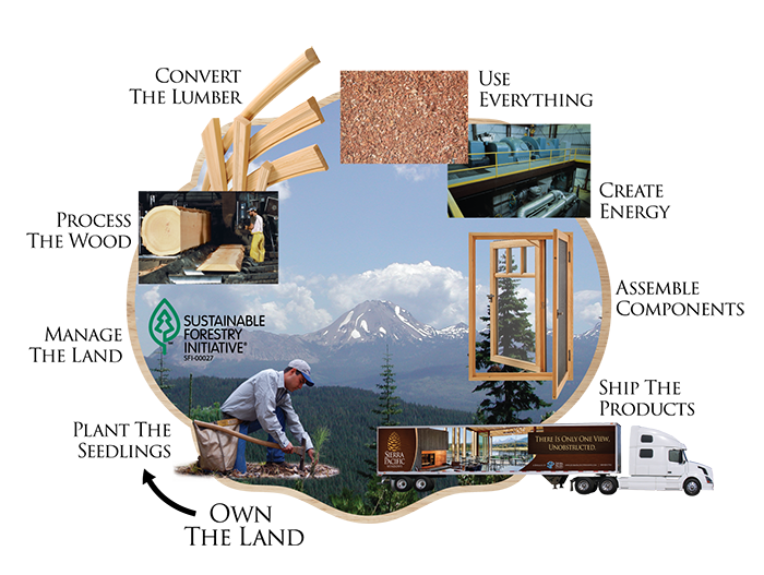 Each year they plant up to six million new trees across their ownership in California and Washington. Wood is processed in 14 sawmills in the Pacific Northwest. Bark and fiber created from processing are used as boiler fuel and their eight cogeneration facilities produce more than enough power to operate their mills. Lumber produced at their sawmill are then converted into pieces for window (and door) components. Those milled pieces are assembled into world-class windows and doors in one of their three manufacturing facilities. Sierra Pacific carefully controls the transportation of their products to ensure they arrive at their dealers, distributors and company stores across the nation.