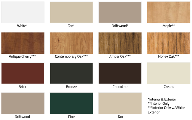 Cool and light exterior colors for your home include White, Tan, Cream, or Driftwood. For a more decadent, warmer feel, you can also select a bolder exterior choice of Brick, Bronze, Chocolate, Espresso (West only), or Pine. View samples in person before making a decision, as colors on the web could differ from the actual vinyl color.