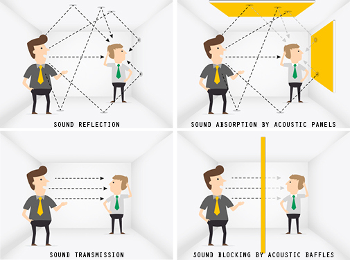 Sound Absorption is the phenomenon that involves the application of materials to walls or ceilings that absorb the sound from within the room. Normally, solutions like the use of acoustic panels, tiles, clouds, and ceiling baffles are all effective sound absorption choices. They are designed and fabricated to dampen reverberation and reduce reflected sound in a properly treated space.