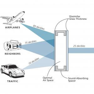 In order to block outside noises from entering your home, there can be a variety of solutions. Noise reduction is directly proportional to the thickness of the glass. Also, adding spaces between the panes of glass↗, and inserting heavy and inert gases like Argon in these spaces help reduce noise even further.
