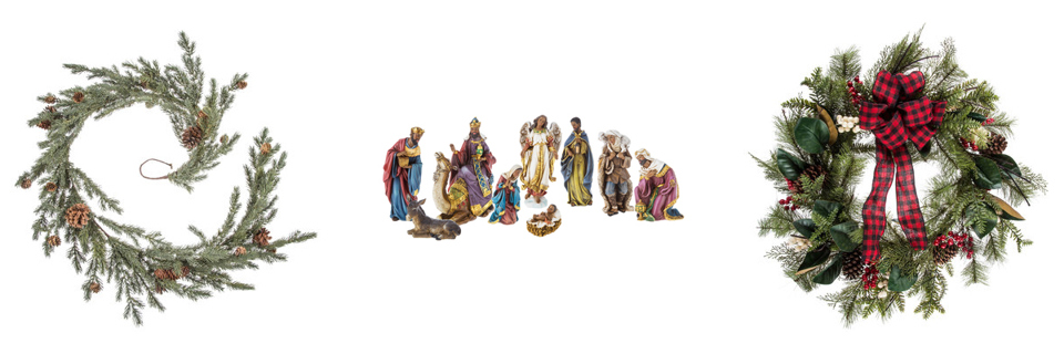 Garlands, wreaths, nativity sets and more, images from Hobby Lobby(↗).