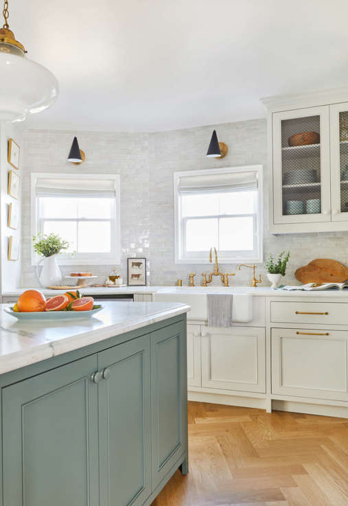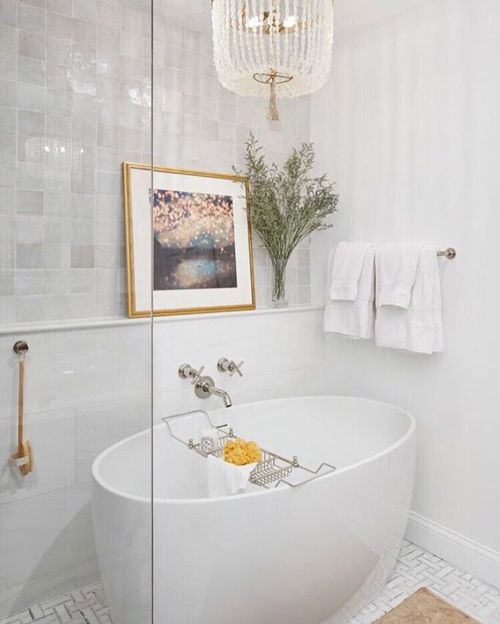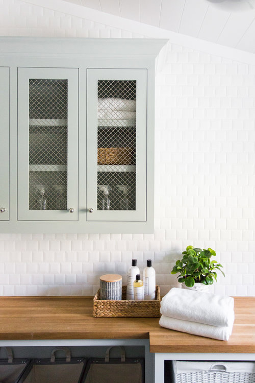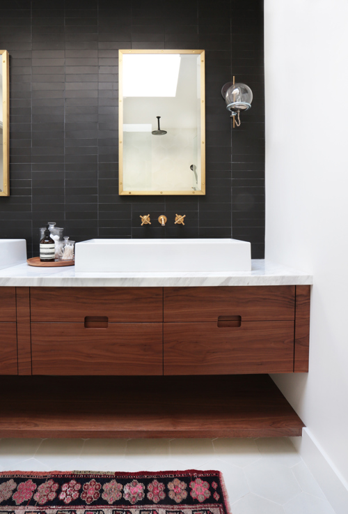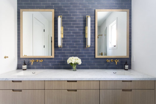 Amber Interiors nailed it with this design--a bold color with a stacked pattern. This was my inspiration in a recent renovation project. Instead of a blank wall behind mirrors, use a fun tile pattern/color to take your bathroom to the next level.