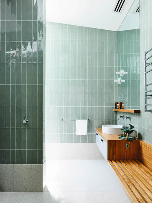 This vertical stacked pattern from Architects EAT is gorgeous, modern and creates a refreshing bathroom retreat. Don't you get that spa feeling from this space?