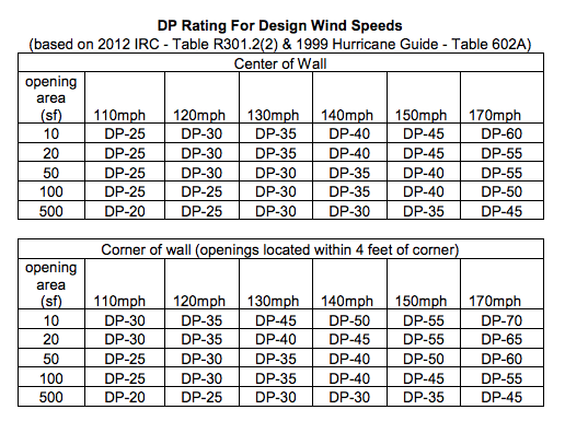 DP rating requirements for each design wind speed per the International Residential Code and the Guidelines for Hurricane Resistant Residential Construction