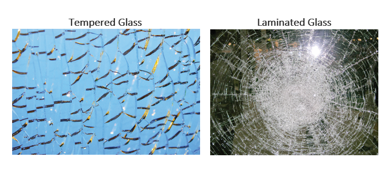 Tempered glass is just a normal type of glass that is specially heat-treated to make it safer in case of breakage. It is commonly used in glass showers and patio doors. When tempered glass breaks it fragments into small pieces instead of larger shards of glass. When laminated glass breaks the glass fragments tend to adhere to the plastic interlayer between the layers of glass. The plastic layer also helps prevent water, wind, and wind-borne debris from entering your home or building.