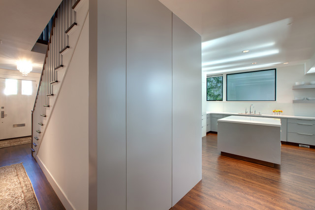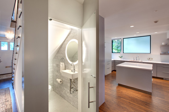 Hidden powder room in a contemporary Austin kitchen.