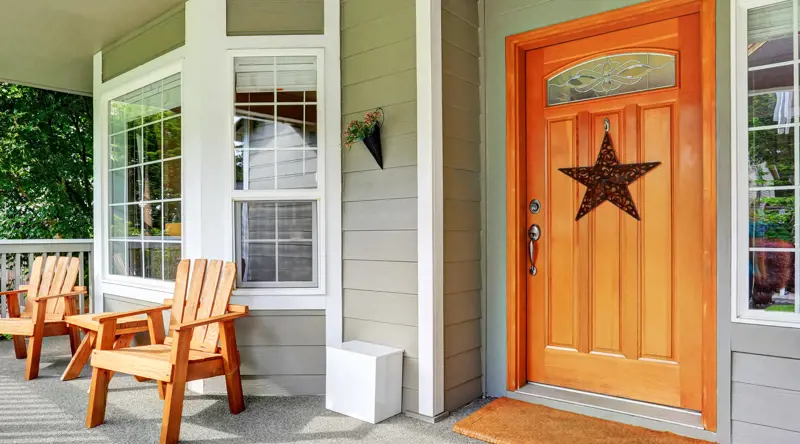 Wood clad doors use a wood veneer over a core material like composite, steel, fiberglass, or aluminum. Many of these doors look like wood on the side facing the interior of a home and another material on the exterior side. They're versatile and modern, providing the visual appeal of solid wood for home interiors while giving additional protection from outdoor conditions. People often call composite faux wood, and it's lighter and more durable than solid wood. Metal doors are more durable as well.