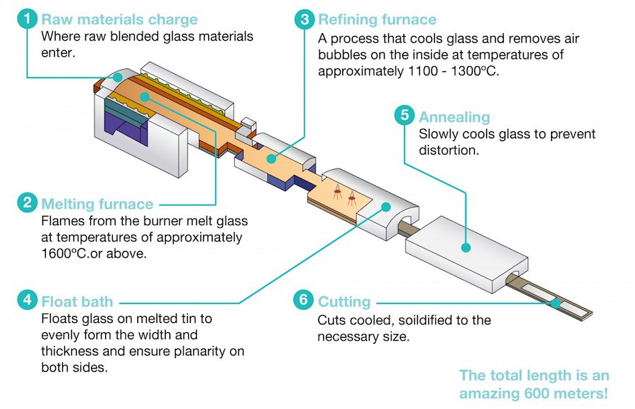 During the production process for float glass, molten glass is taken from a furnace and poured into a chamber, within which is a bed of molten tin. As a result of a specially controlled environment within the chamber, glass floats on the molten tin and takes on the form of a container. The thickness of the glass is decided on before manufacture. The width at which it is spread is between 90 and 140 inches.