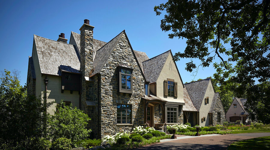 French Eclectic homes are sometimes confused for English Tudor architecture. Both styles have a similar approach to using varied materials for the facade and the use of half-timber. The difference can be seen in the doorways, with Tudor homes making use of round-arched entry porches and a dominant front-facing gable.