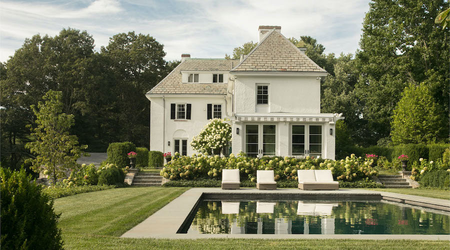 French Eclectic homes offer some creative licenses. The steeply pitched roof is the most common feature. The form is symmetrical, asymmetrical, or towered. Patrick Ahearn's French Eclectic project in Dover↗ considers the modern family needs. With its steep roof, shutters, and french doors, this property is charming and stands proudly in its surroundings.
