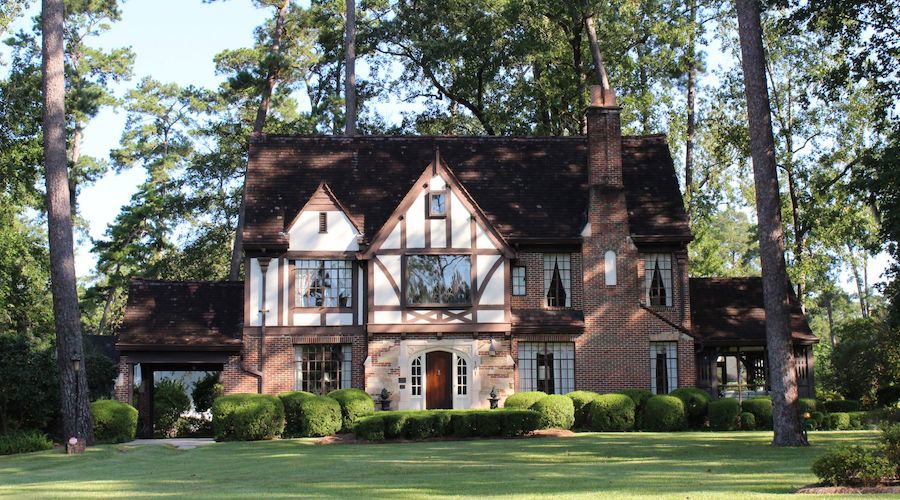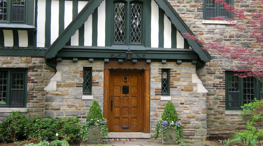 Imagine a Medieval English building from the Tudor period of 1485 and 1603. The dark exposed timber, the lattice windows, and the gothic charm inspired Tudor architecture's emergence in U.S. neighborhoods during the late-19th century. Tudor architecture was associated with the Arts and Crafts movement, much like Prairie and Craftsman architecture. You can see the similarity in the exposed woods, solid masonry, unique decorated details, and fine handiwork around the home.