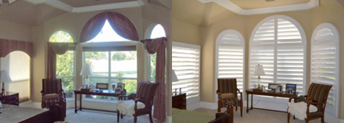 Plantation shutters are a great choice for a timeless look. A good set of plantation shutters are sized to fit your windows so there are no gaps around the outside. You can open and close slats to your comfort like you can with drapery. Want more light? No problem, open the slats. Want to cool down the house? Easy, close the slats.
